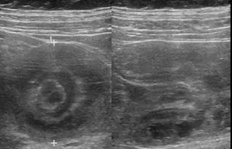 A ultrassonografia é uma modalidade de exame muito efetivo e confiável para a demonstração da intussuscepção. Caracteristicamente, uma massa cilíndrica é observada, consistindo em um anel hipoecoico externo que circunda tecidos com ecogenicidade variável e representam as camadas do intestino edemaciadas que se alternam com camadas do mesentério conhecido como “sinal do alvo”. Outros sinais incluem sinal de donut e pseudo-rim. A ultrassonografia com Doppler tem sido utilizada para estimar a viabilidade do tecido.