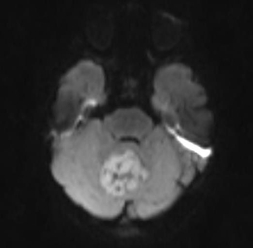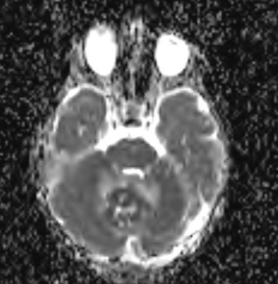 - DWI / ADC sinal DWI alto ("difusão restrita") valores de ADC baixos (cerebelo mais baixo do que o normal, por exemplo, ~ 550 x 10-6 mm2 / s)